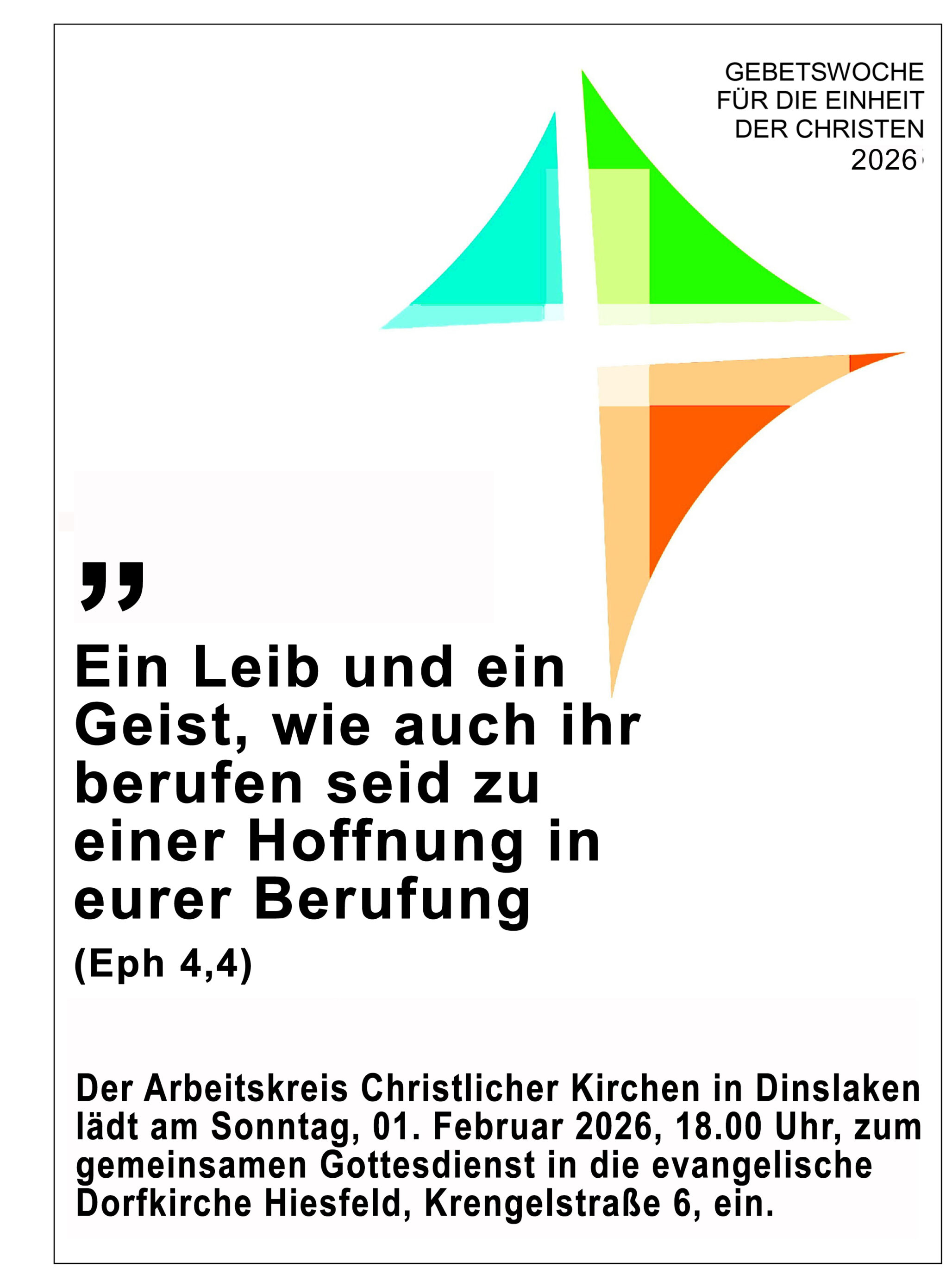 Der Gottesdienst für die Einheit der Christen 2026 findet in Dinslaken in diesem Jahr am 1. Februar statt. Das Motto: „Ein Leib und ein Geist, wie ihr auch berufen seid zu einer Hoffnung in eurer Berufung“ ist inspiriert von der armenischen Kirche und fokussiert auf die gemeinsame Identität der Christen und auf ihren Auftrag trotz Vielfalt. Der Gottesdienst wird ausgerichtet von der ökumenischen Arbeitsgruppe bestehend aus Vertretern der katholischen, evangelischen, neuapostolischen, freikirchlichen und apostolischen Gemeinden der Stadt.